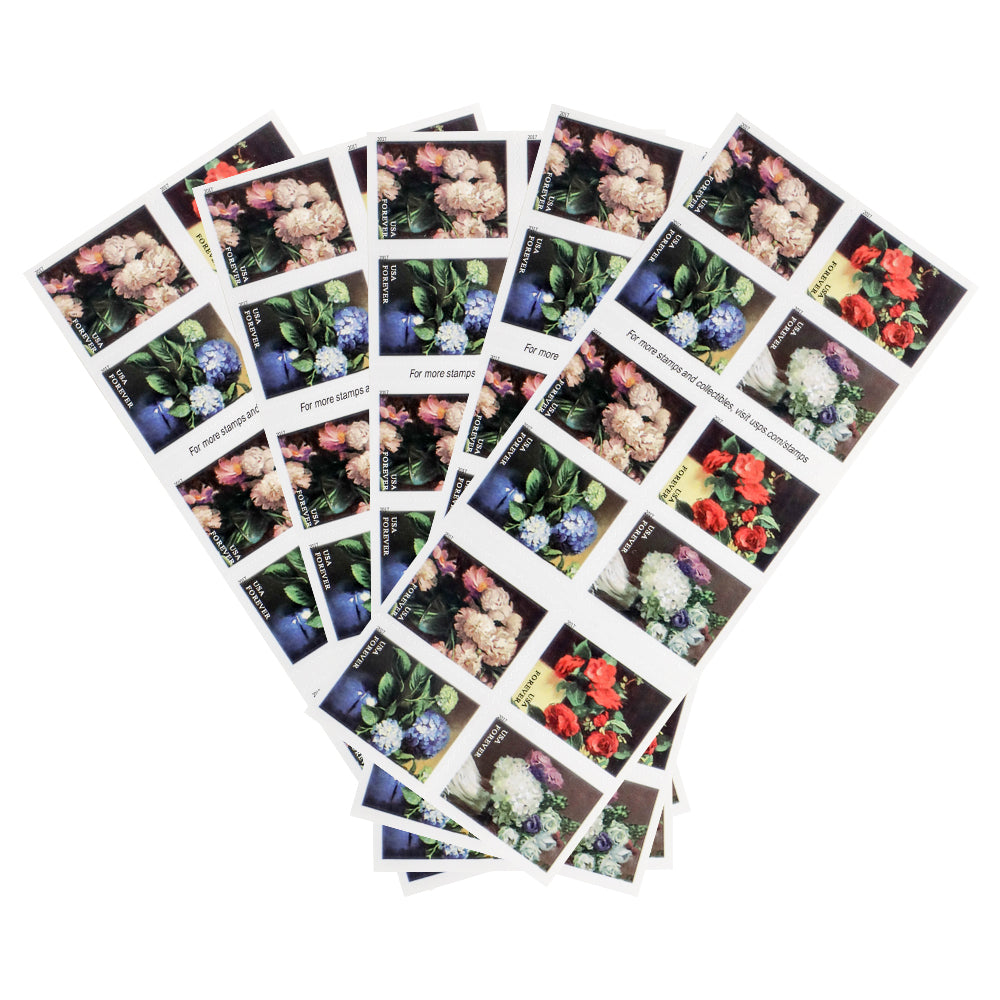 The 20-stamp sheet features four images inspired by 17th and 18th century still-life paintings of garden flowers: red camellias and yellow forsythia in a pitcher; white peonies and pink tree peonies in a vase; white hydrangeas, white and pink roses, green hypericum berries and purple lisianthus in a vase; and blue hydrangeas in a pot.