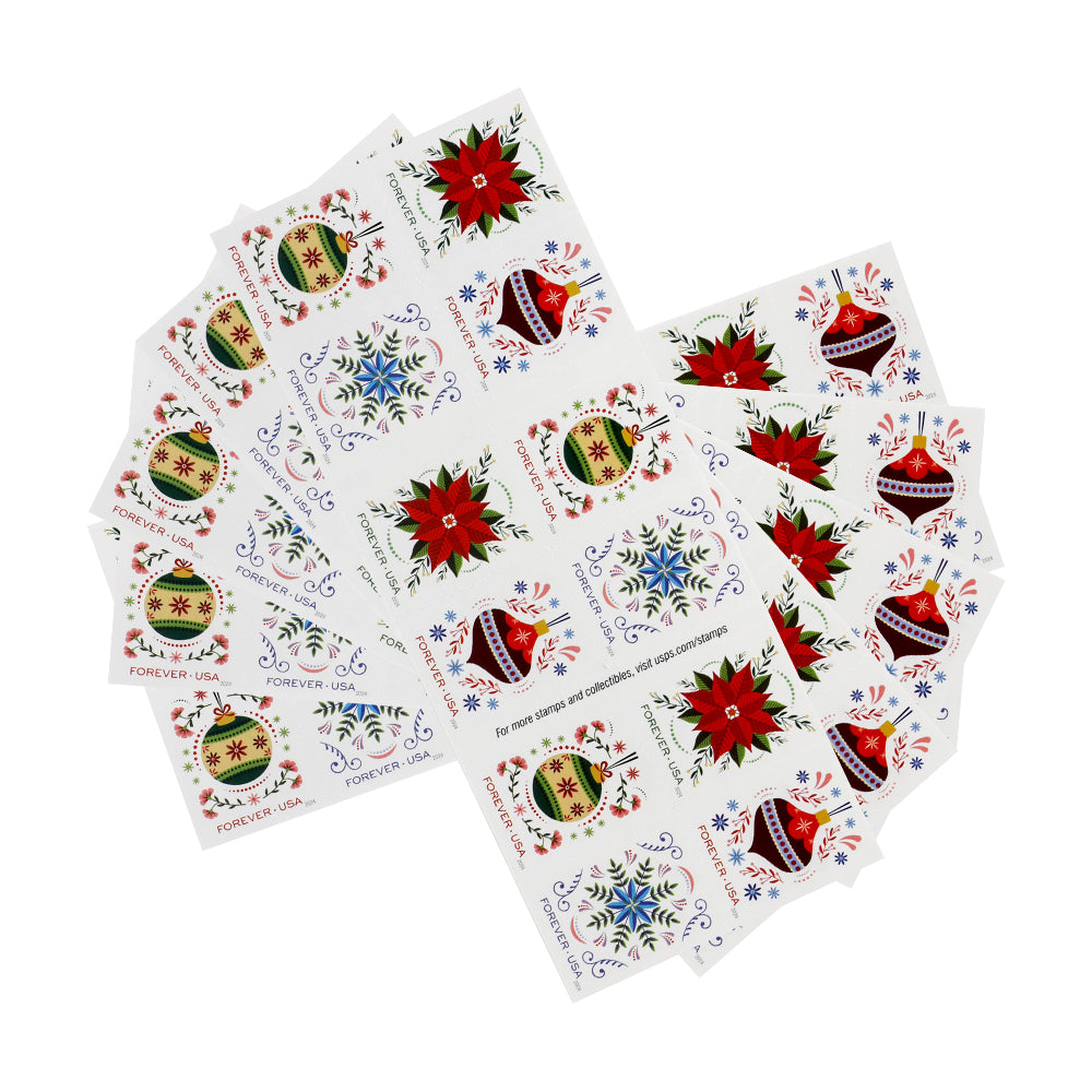 Four new art-inspired holiday stamp designs feature two colorful Christmas ornaments, a vibrant poinsettia surrounded by greenery, and a whimsical blue flower centered against green leaves and delicate scrollwork. Antonio Alcalá, an art director for USPS, designed the stamps and booklet of 20, using original digital illustrations by Michelle Muñoz.